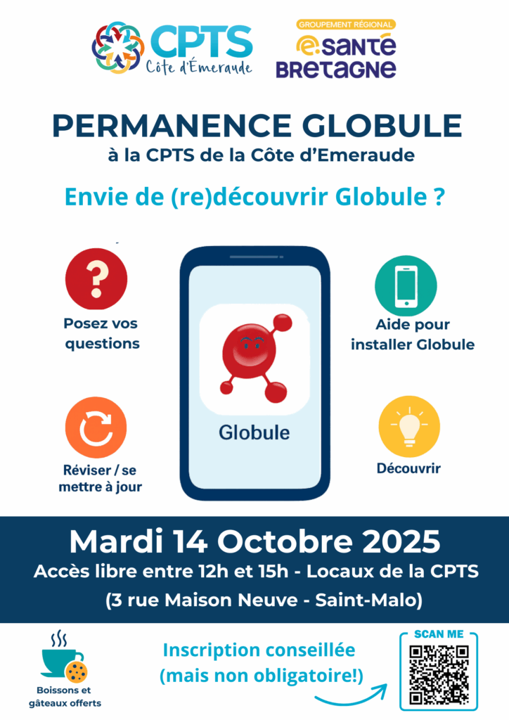 Dans ce cadre, la CPTS de la Côte d’Émeraude a le plaisir d’accueillir le Mardi 14 Octobre de 12h à 15h une permanence dédiée à l’application Globule. Cette permanence sera animée par Aude Barrier-Champon, nouvelle référente locale du groupement e-Santé Bretagne sur le territoire du T6.